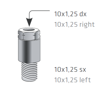 Funzione di Conversione: Trasforma la filettatura da M10x1,25 DX (standard) a M10x1,25 SX (sinistro/contrario).