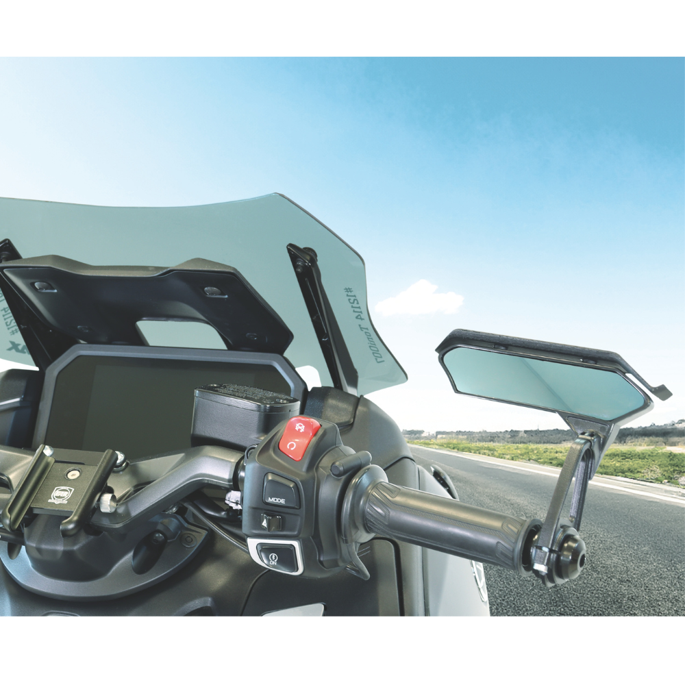 Pensato per i motociclisti che vogliono trasformare il proprio T-MAX in una vera sportiva da strada, il retrovisore F1 RACE è una scelta tecnica e stilistica ad alto impatto. Il suo design aggressivo, ispirato al mondo delle corse, è impreziosito da un alettone aerodinamico integrato che ne esalta la personalità racing.